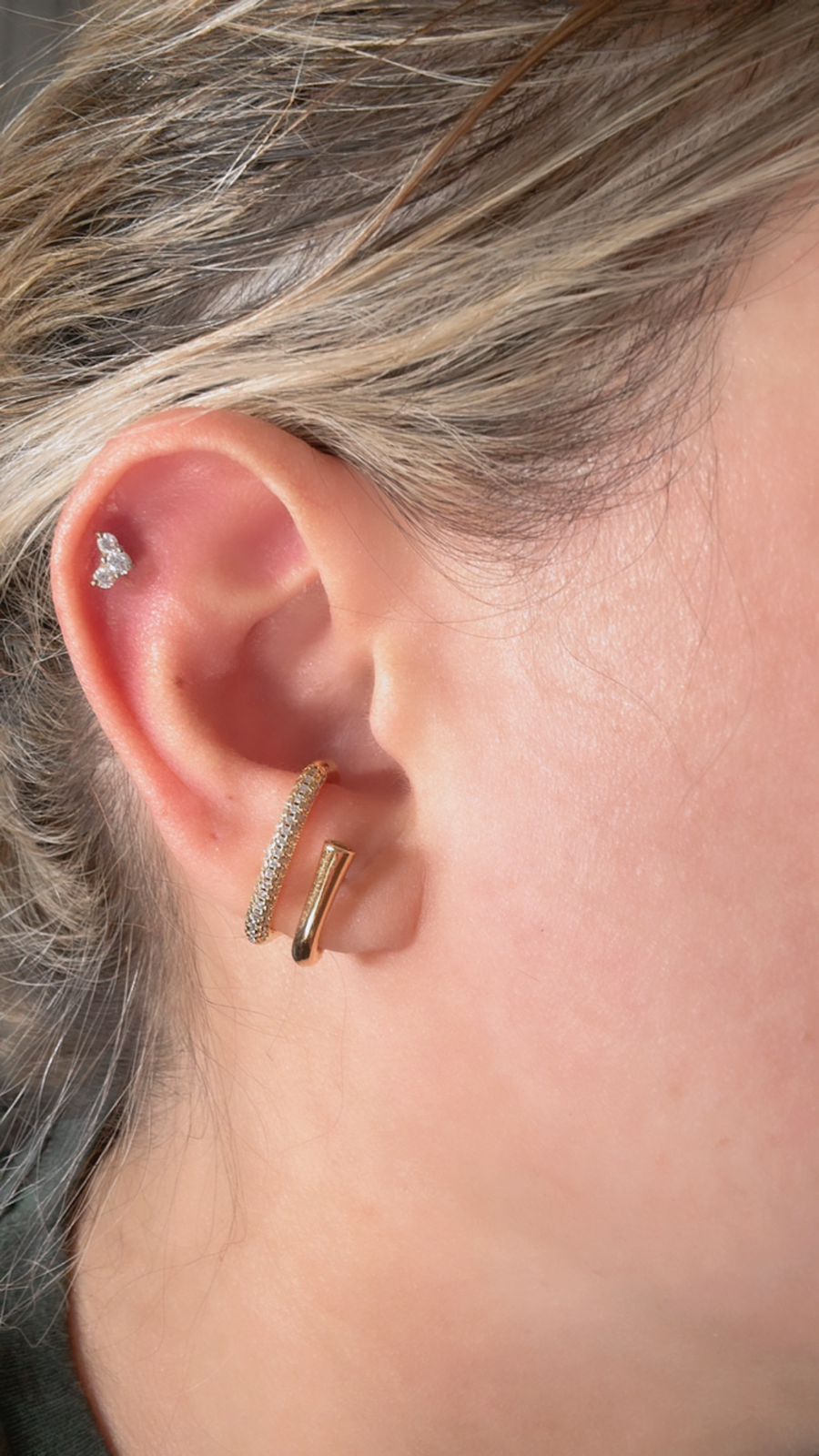 O ear hook é aquele brinco que veio para ficar, sendo a sua tradução “gancho de orelha” ele fica perfeito já que o seu formato fica encaixado no antítrago. Sendo uma peça única e indispensável, ele traz modernidade e delicadeza, caindo bem em qualquer composição, desde um visual moderno até mesmo clássico. Além disso fica ainda mais charmoso combinado com um mix, trazendo um diferencial para o look.