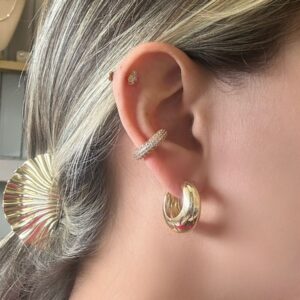 O material base consiste em uma liga metálica de cobre e zinco e recebe o banho de ouro ou ródio branco, acrescentamos também um verniz de proteção que garante uma durabilidade maior da peça. Nossas peças não possuem o níquel em sua composição e utilização uma camada antialérgica.