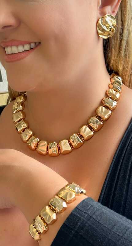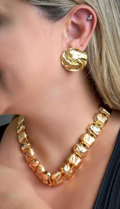 O material base consiste em uma liga metálica de cobre e zinco e recebe o banho de ouro ou ródio branco, acrescentamos também um verniz de proteção que garante uma durabilidade maior da peça. Nossas peças não possuem o níquel em sua composição e utilização uma camada antialérgica.